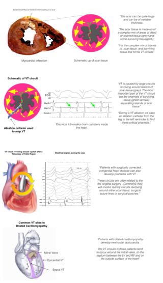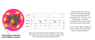 The aim of this procedure is to target the origin of the VT by placing a long, thin wire or catheter into the heart chambers through the veins of the leg. When areas that are critical to the VT circuit are identified, radiofrequency energy is applied to a small area (4 to 5 mm in diameter) to destroy the abnormal tissue. The number of burns required to treat the VT varies among patients. In patients with scar tissue in the heart, ablations may be performed within the scar and around its perimeter to cauterize or ablate the abnormal electric circuit responsible for the VT.