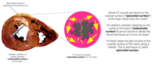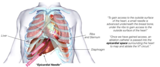 In some instances, the physician determines that the VT may originate from a circuit on the outer surface of the heart, or epicardium. If this is the case, a puncture into the sac, or pericardium, around the heart is performed just beneath the breastbone. This enables the ablation catheter to be inserted and maneuverer within the pericardium to determine whether the VT originates there. If a patient has a previous history of open heart surgery, a small surgical incision may be necessary to access the pericardium because of the presence of scar tissue, which can make the
