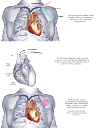 Usually 2 leads (special wires which connect the defibrillator with the heart) are inserted into the heart via the vein under the collarbone. These are manipulated into the heart under X-Ray control. Most commonly 2 leads are inserted, one into the right atrium and one into the right ventricle. These leads attach to the heart wall either with small hooks or with a small screw. Depending on your heart problem sometimes only 1 lead is inserted and on other occasions it will be necessary to add a third lead. Your doctor will discuss this with you.